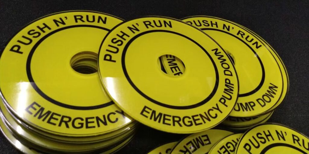 ป้ายกำกับสำหรับปุ่ม Emergency Stop ใช้เพื่อความปลอดภัยในโรงงานอุตสาหกรรม เครื่องจักร และสายการผลิต เพื่อให้ผู้ใช้งานมองเห็นปุ่มหยุดฉุกเฉินได้ชัดเจน ใช้งานได้ทันทีเมื่อเกิดเหตุไม่คาดคิด